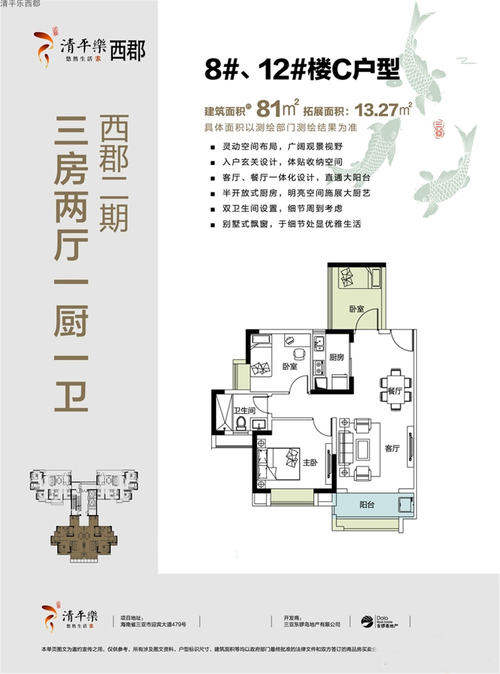 清平乐西郡位于三亚市迎宾路(吉阳政府旁)。项目现推部分特价房源,户型建筑面积为81平三房,赠送面积13平, 优惠单价约13200元/平,一口价总价低至107万/套,现房即买即住,售完即止!现购房全款78折,按揭8折,暂不做分期,精装折后开盘价约13700元/平...