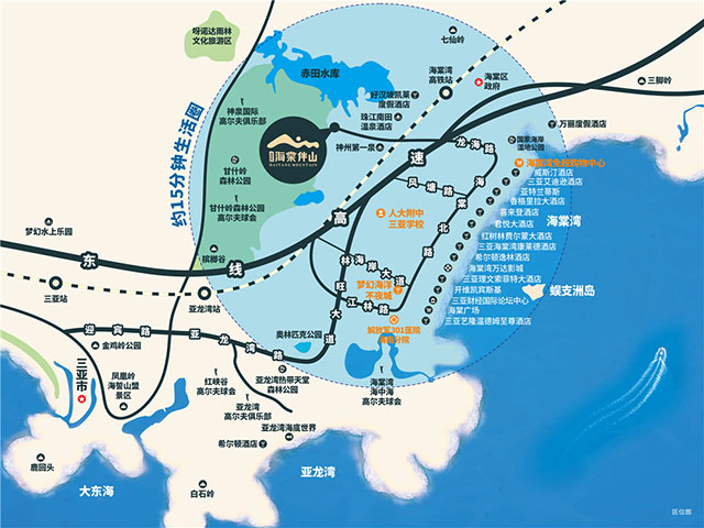 项目地处神泉大道旁,毗邻海棠湾动车站(建设中),距G98海南环岛高速海棠湾藤桥出口、免税店及海棠湾星*级酒店带、301医院、亚龙湾、三亚市区及凤凰国*际机场较近,实现旅游、度假、出行、生活圈。