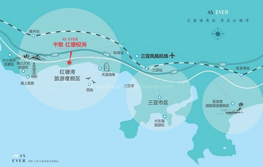 中粮红塘悦海位于三亚市天涯区红塘湾旅游度假中心核心地段,三面环山。南侧是红塘湾高尔夫球场,西侧是规划的入海通道,东侧支路为市政道路,北侧为225国道和西线高速;项目毗邻海南西环高铁。项目内部配套有会所顶层无边际泳池,605㎡中央大泳池,北区运动广场和南区生活广场,体验式社区购物中心;内建有1个会所,内设业主食堂、邮政所、急救站、娱乐设施等配套。