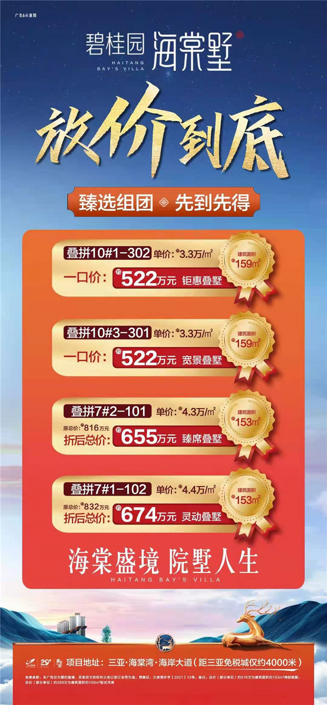 碧桂园海棠墅臻选组团推出4套别墅,先到先得,洋房建筑面积107㎡3+1房,叠墅下叠建筑面积约154㎡,带首层花园及地下室,上叠建筑面积约159㎡,带天台,洋房均价29700元/㎡,全款享99折优惠。以上信息供参考,具体信息仍需参考现场实际销售情况。