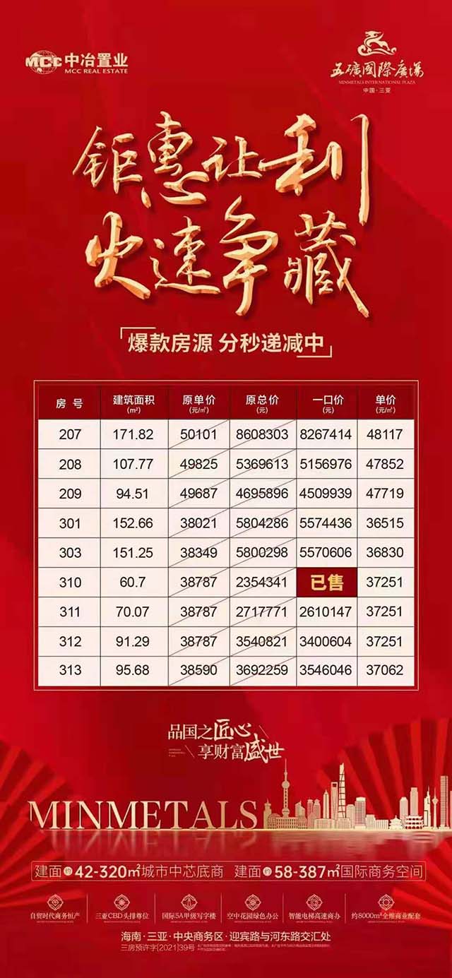 五矿国际广场项目主力户型建筑面积约42-320㎡城市中芯底商、58-387㎡国际商务空间,均价29000元/㎡起,全款享99折优惠。以上信息供参考,具体信息仍需参考现场实际销售情况。