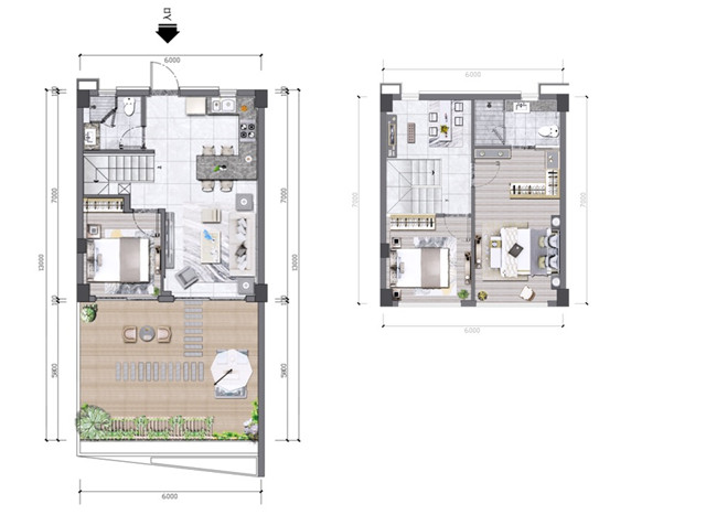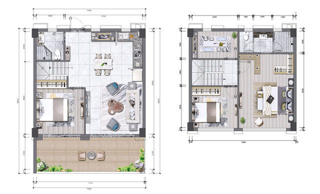 1F客厅及厨房、1F客卧、1F超大阳台