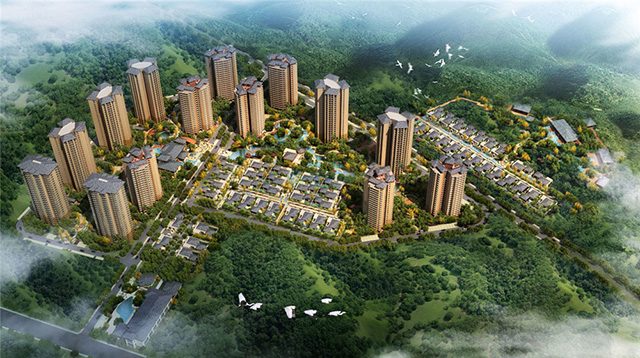 项目依山而建,高层精品公寓高于水平面20米左右,半山独栋别墅高于水平面21米以上。建筑造型简洁大方,竖线条手法使立面庄重典雅,阳台错搭、角窗设计及优雅的四坡屋顶使建筑充满东南亚美感,俨然一 幅城市新景观。